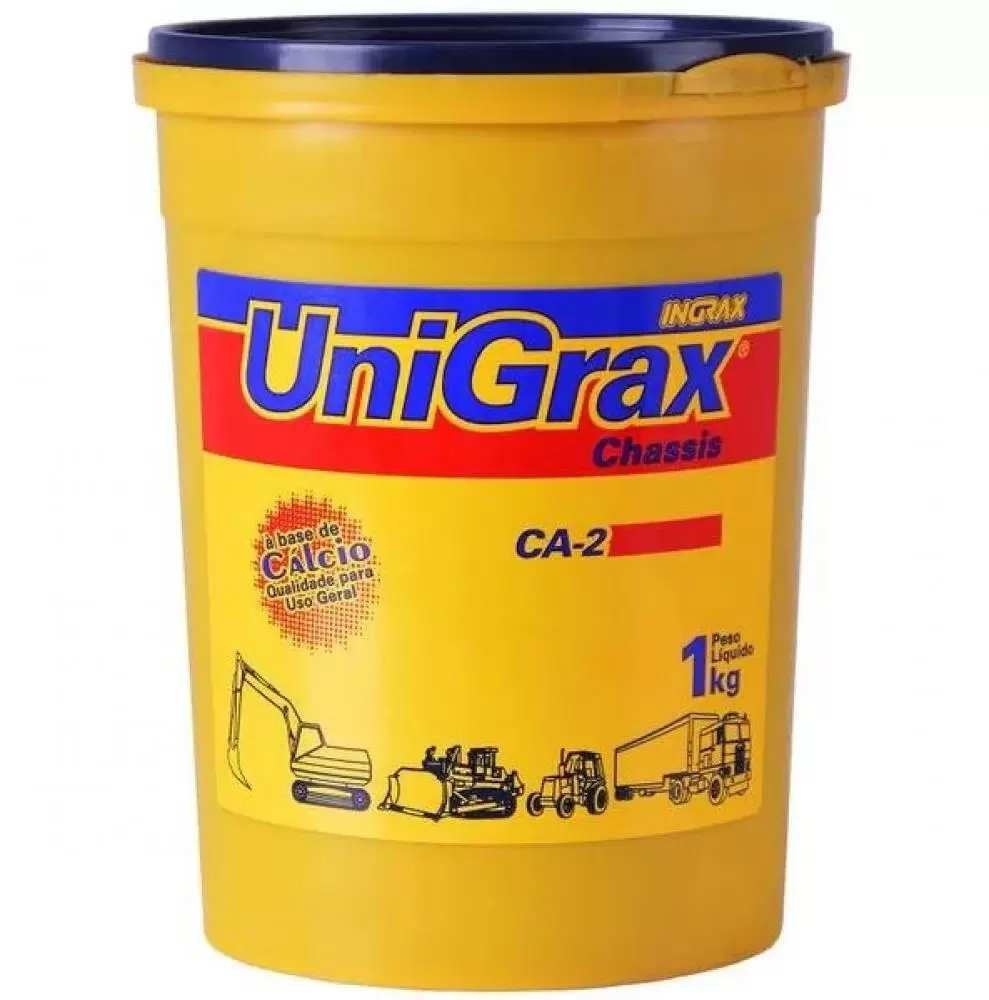 Unigrax ca é uma graxa à base de cálcio, hidro-repelente, fabricada com óleo lubrificante de alta viscosidade, tendo uma cor castanho escura e grande adesividade. Recomendada para lubrificação das articulações de chassis de caminhões, automóveis, tratores, motocicletas, máquinas agrícolas, mancais de deslizamento e sempre que necessite de uma graxa para trabalhos em temperaturas não superiores a 70ºc. É também utilizada em indústrias pesadas, tais como mineração, laminação de aço e metais não ferrosos, manufatura de produtos químicos e usinagem de metais.