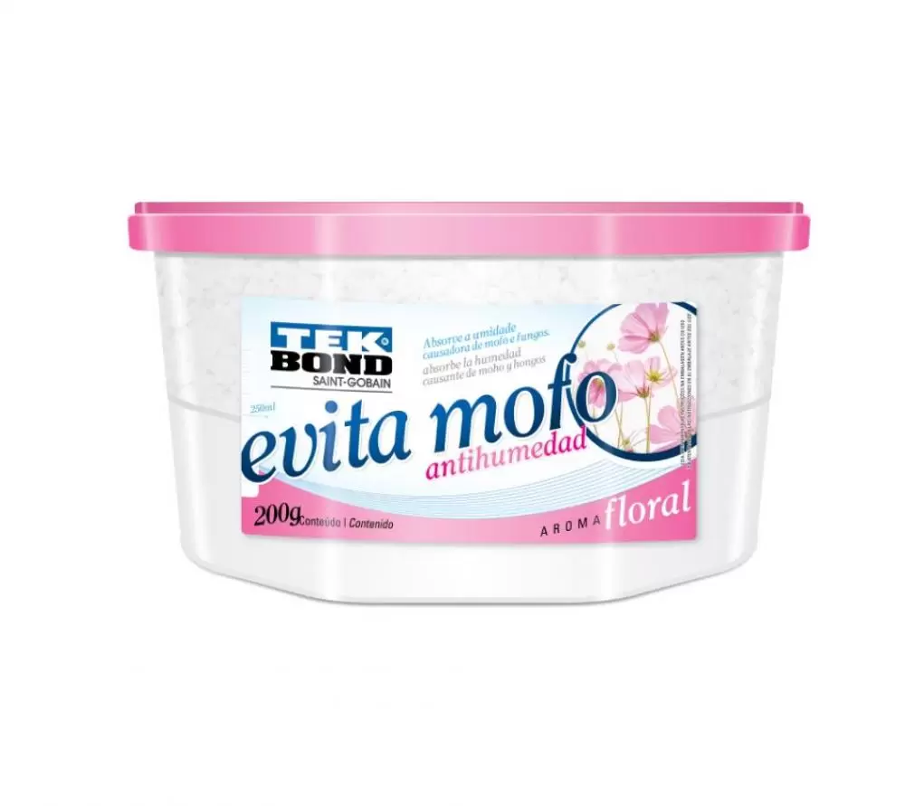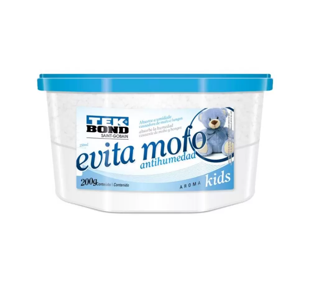 CONSULTE O AROMA DISPONIVELKIDSNEUTROFLORALLAVANDAEVITA MOFOO Evita-Mofo Tekbond é um desumidificador de extrema eficiência que, além de remover a umidade do ambiente, ainda deixa uma leve fragrância enquanto age. Evita problemas com mofo, fungos e mal odor em armários, gavetas, guarda-roupas, baús, dispensas, sapateiras, cofres, barcos, bibliotecas, estoque de madeiras, ambientes fechados e úmidos, com baixa ou nenhuma circulação de ar, entre diversos outros. O Evita Mofo absorve a umidade do ambiente e armazena a água no pote. MODO DE USO:1. Limpe o local onde tiver mofo antes de colocar o evita mofo. 2. Remova a tampa da embalagem e retire o lacre de alumínio, com cuidado para não remover ou danificar o filtro branco que fica embaixo dele.3. Tampe a embalagem e coloque no local.4. Pronto! Ação do produto é iniciada de imediato.5. Quando o nível de água atingir o limite máximo indicado no rótulo da embalagem, substitua por um novo Evita-Mofo Tekbond.Atenção: Descarte o líquido acumulado no ralo e a embalagem no local de plásticos recicláveis. Se o líquido vazar do recipiente pode danificar o que entrar em contato (roupas, material de couro, livros etc.). Se o filtro branco rasgar ou a embalagem quebrar pare de usar e descarte o produto.