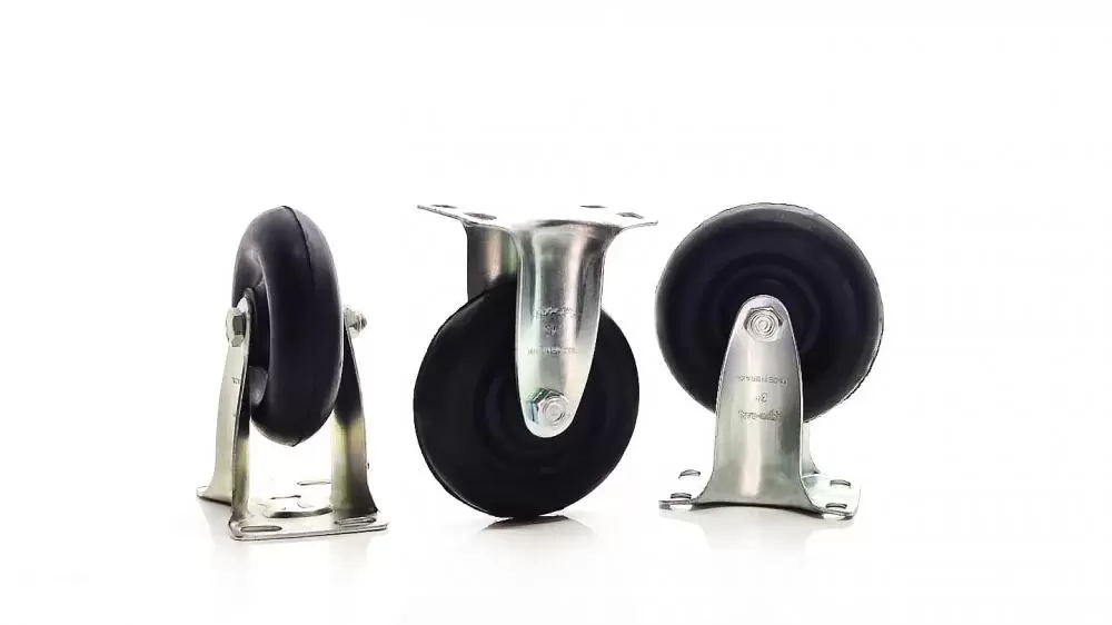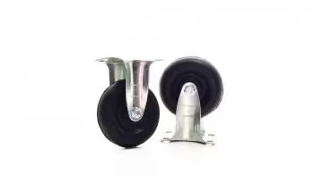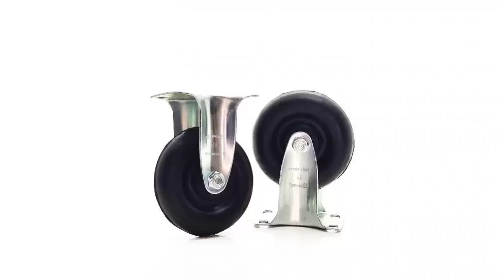 Informações Técnicas Rodízio fixo, linha leve reforçada com placa, marca ROD-CAR, com roda integral de borracha moldada com núcleo em ebonite (dureza 80 a 85 shore A), ref. FLR 310 BIF.